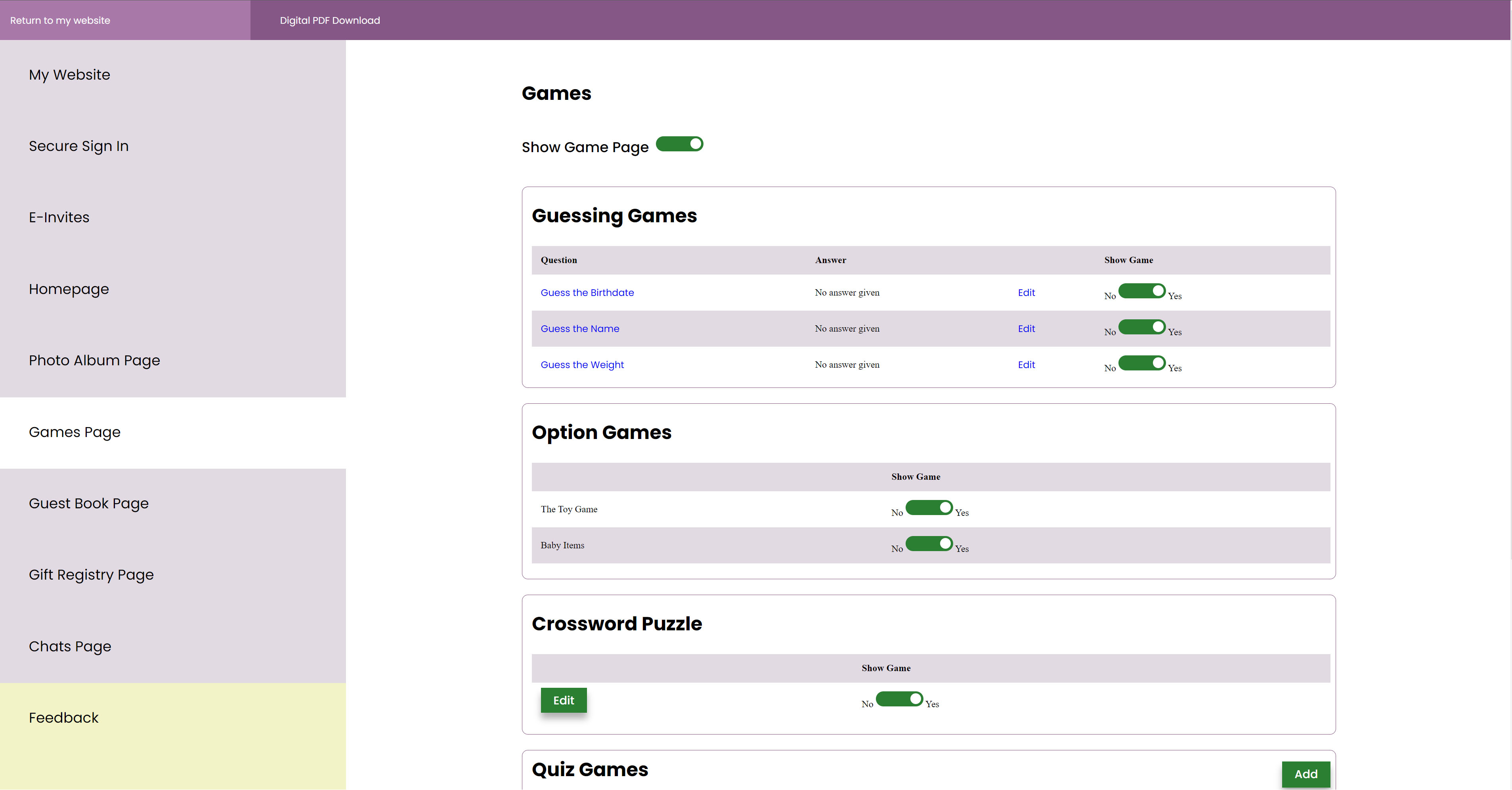 The website is scoped to only three pages (home, gallery, guestbook), game page and two additional pages for sharing links (gift registry and chats).